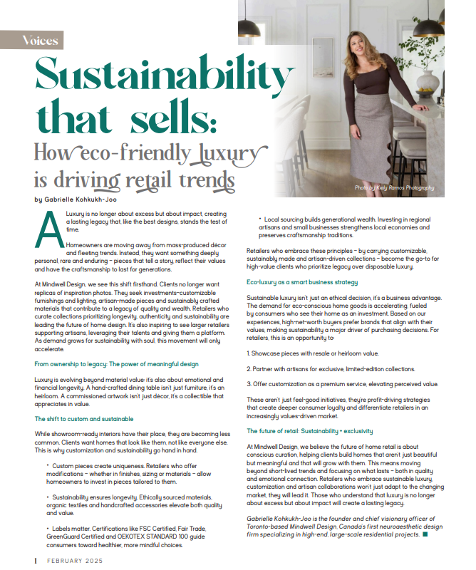 At Mindwell Design, we are witnessing a powerful evolution in how clients define luxury. As outlined in Home Accents Today’s recent feature, “Sustainability That Sells: How Eco-Friendly Luxury is Driving Retail Trends”, homeowners are moving away from disposable trends and mass production in favor of meaningful investments—pieces that reflect their identity, values, and legacy.